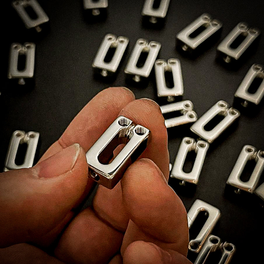 Ramme's guitar bridges feature manually polished stainless steel components, offering a sleek, premium finish. Unlike the chrome plating used by some other brands, this meticulous process ensures lasting beauty and durability.