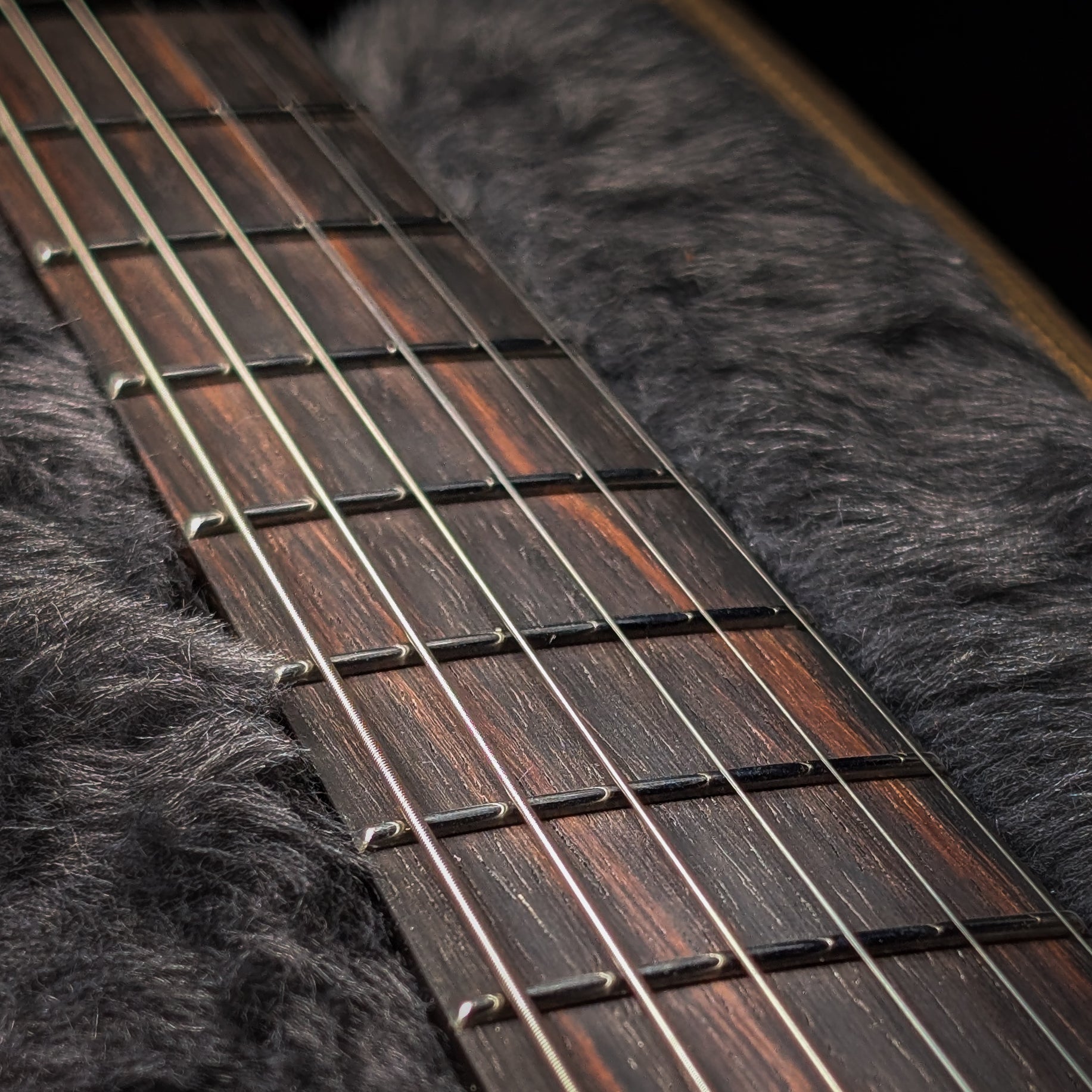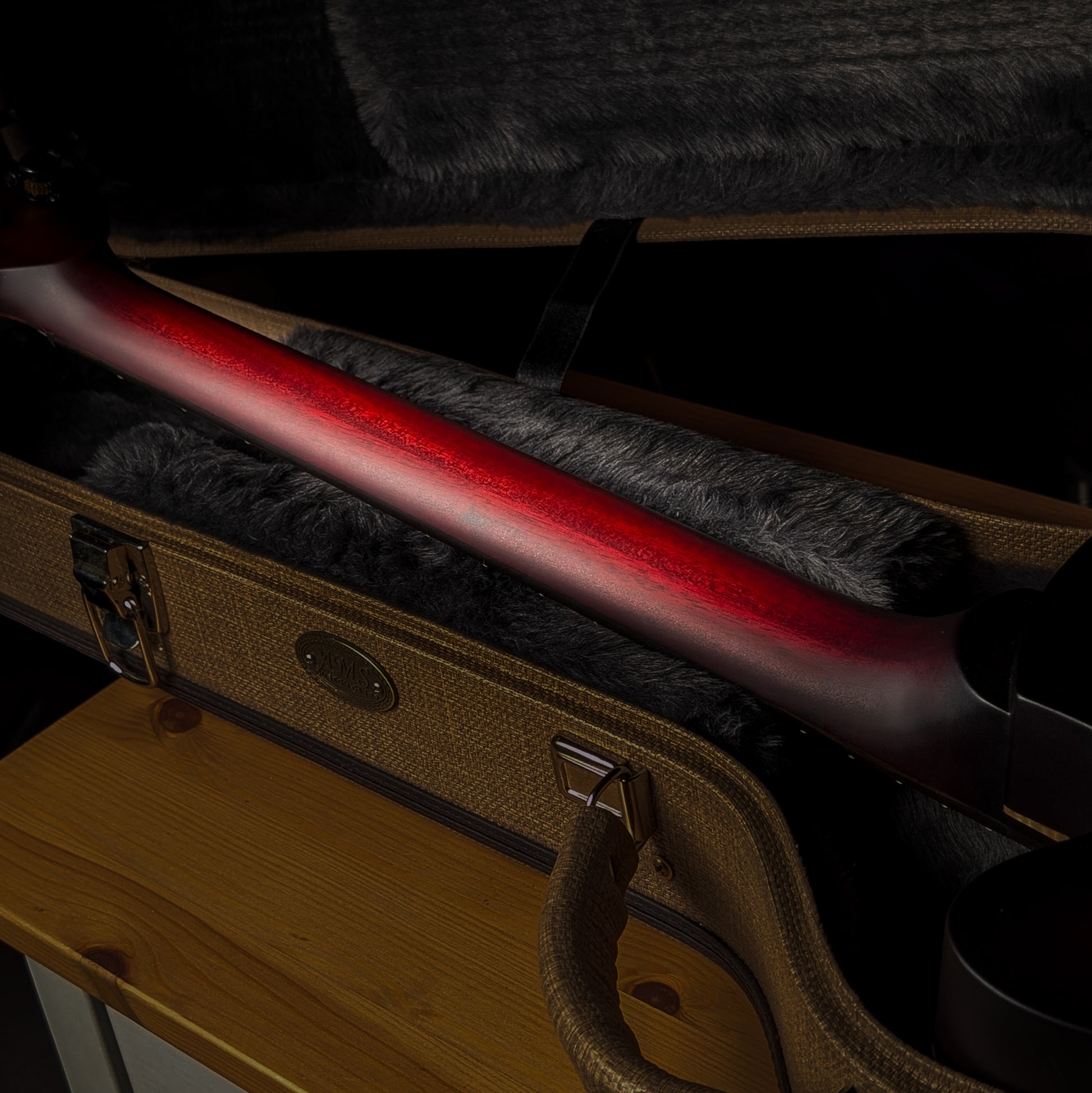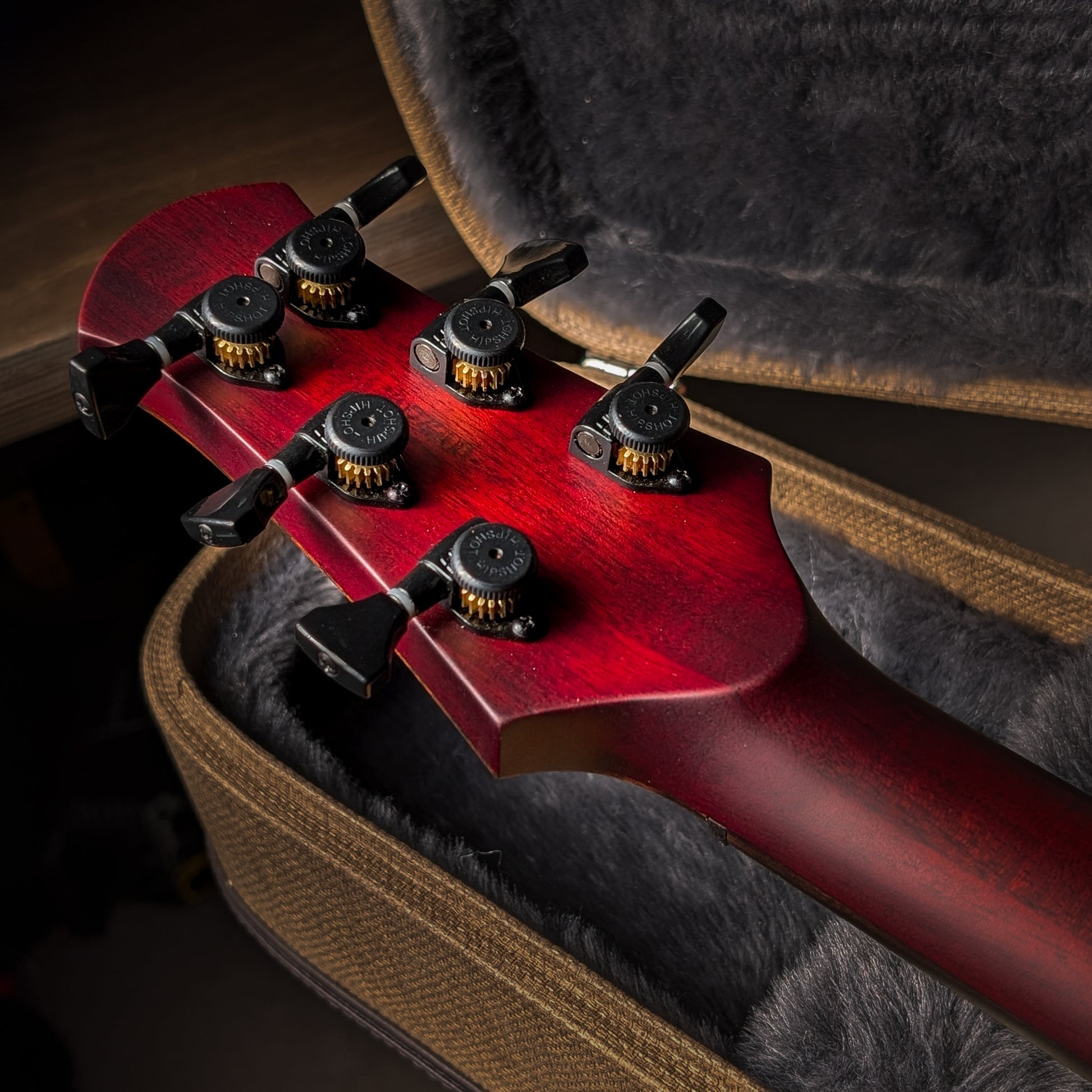 The Canalli CJC-145 features a revolutionary spoke wheel truss rod, offering unprecedented control over neck curvature. This innovative design allows for precise adjustments, ensuring optimal playability and tone. With a simple turn of the wheel, you can fine-tune your instrument to perfection, eliminating the need for complex adjustments and specialized tools. This direct access to the truss rod also prevents common issues like stripped screw heads, enhancing the instrument's longevity. By eliminating the traditional headstock cavity, this design has increased the headstock's rigidity, resulting in improved sustain and reduced unwanted vibrations. Additionally, the new truss rod configuration reduces stress on the headstock, minimizing the risk of cracks and extending the instrument's lifespan.