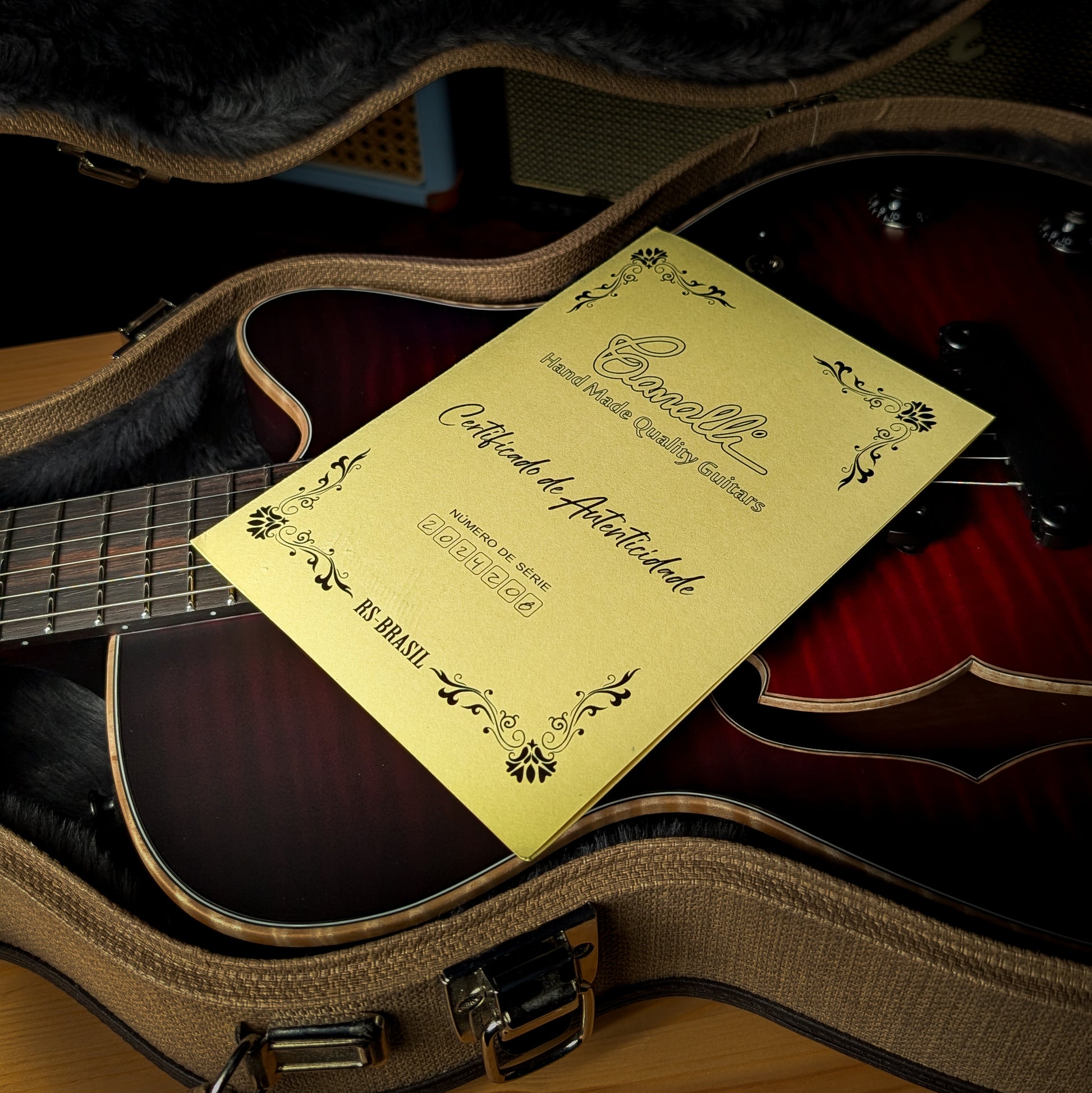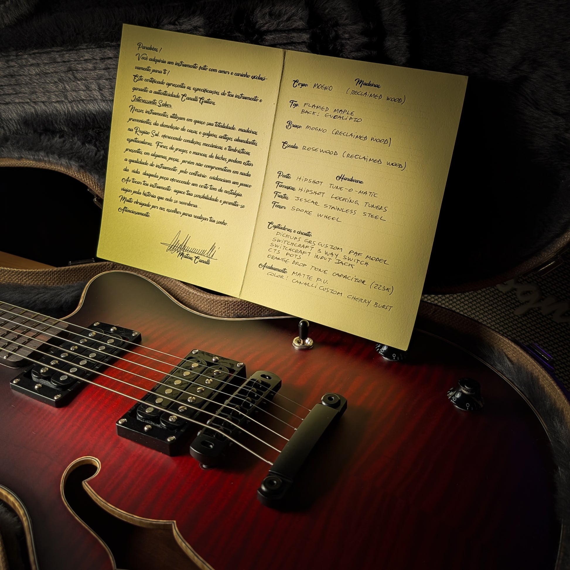 The Canalli CJC-145 is a captivating semi-hollow electric guitar, a collaborative effort between renowned guitarist João Castilho and luthier Mateus Canalli. The name "CJC-145" is a fusion of the creators' initials and the guitar's distinctive 14.5" body width. This unique design, inspired by classic guitar models, offers a versatile tonal palette that seamlessly blends warm, resonant tones with a crisp, articulate attack. The CJC-145 is a testament to the synergy of traditional craftsmanship and innovative design, making it a sought-after instrument for players seeking exceptional sound and playability.