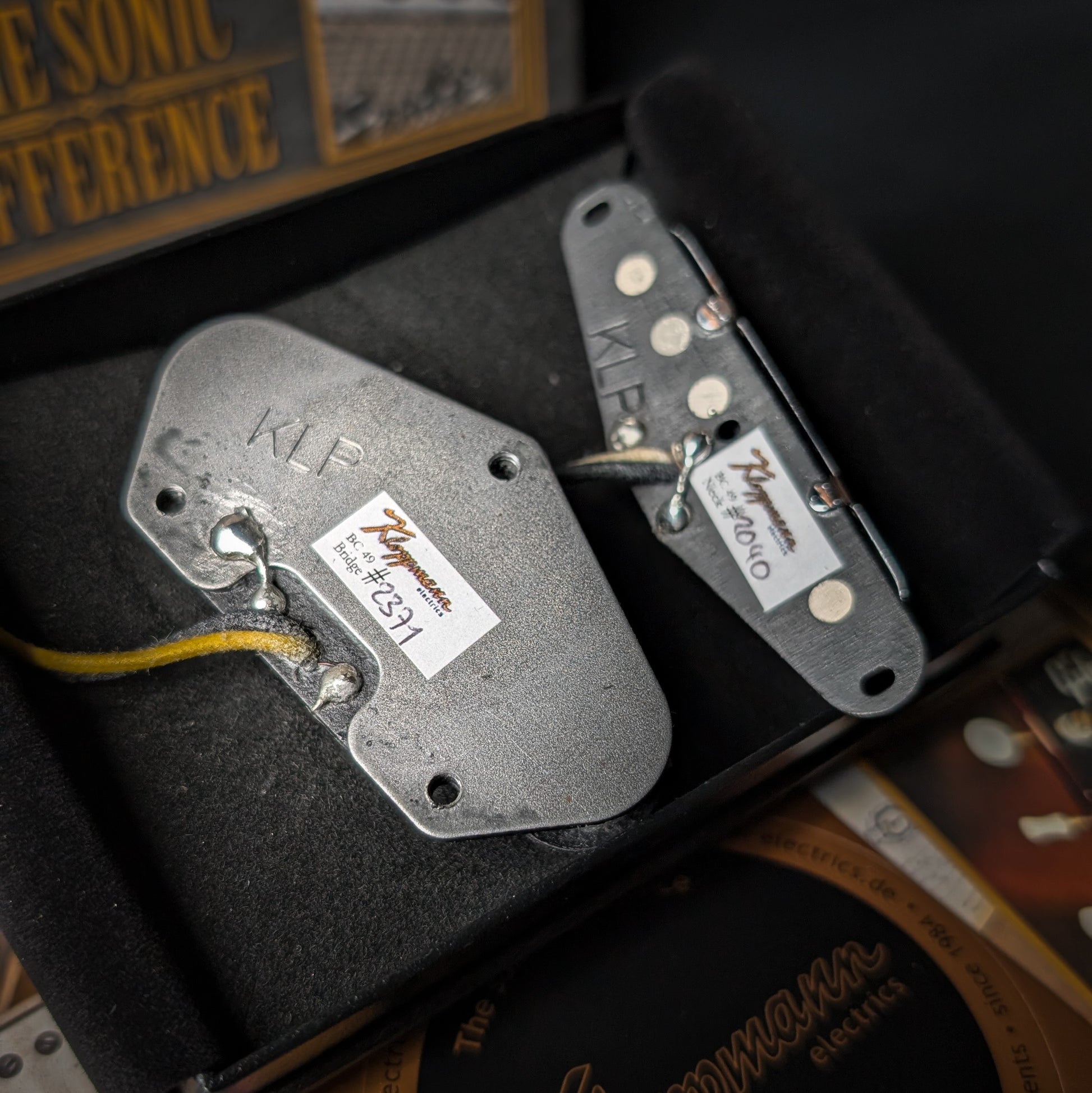 The first pickups Leo Fender made for the Broadcaster were wound with AWG 43 wiring and were a close relative of the Lap-Steel pickups of the time. The BC 49 Set brings that “Mother of all Telecaster Sounds” back to life. The neck pickup has a historically authentic brass cover and has all the original sounds: powerful but somehow more jazz intoned than modern Tele pickups. The BCB 49 bridge pickup sounds fuller in the mids than the TLB 50 bridge pickup and has that fascinating caramel covering: sweet highs and a sliver of “Brown Sugar” to the bass. The BC 49 Set manages to sweeten the authoritative Fender Blackface Amp with a shot of Tweed.