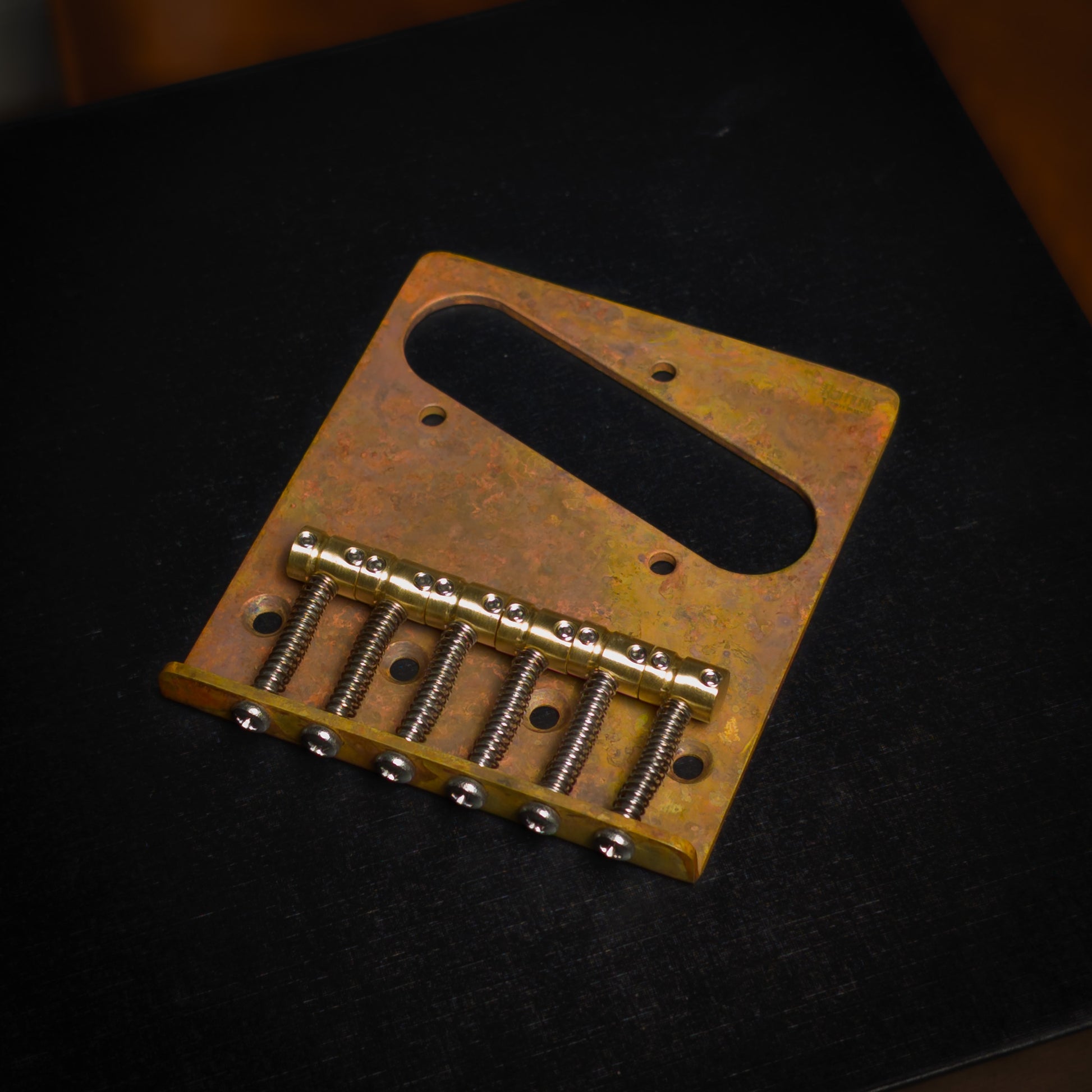 This Ramme TL Vintage 6C Fixed Bridge features an aged brass base plate and six machined brass saddles. The brass base has undergone an aging process to achieve a relic-style appearance.